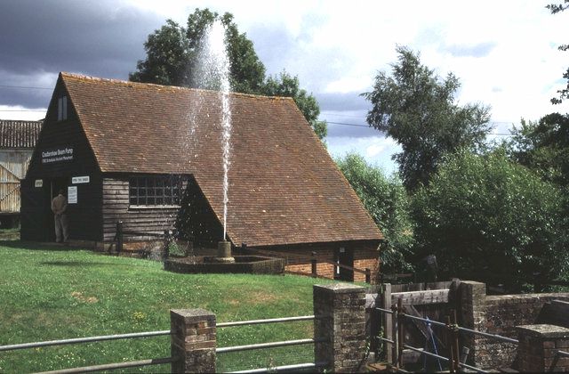 On A285 south of Petworth The fountain is the pump output. This then flows down the slope and actuates an hydraulic ram, thus demonstrating another form of pumping technology (a source of perpetual wonderment to many). The pump is a waterwheel driven three throw pump with the motion passing via long wooden beams. This supplied water to Petworth House photo - text :- Chris Allen - 5 August, 2001 - next trail image |