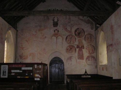 St. Georges medieval painted interior walls click for close up of wall Seven Works of Mercy Seven Deadly Sins