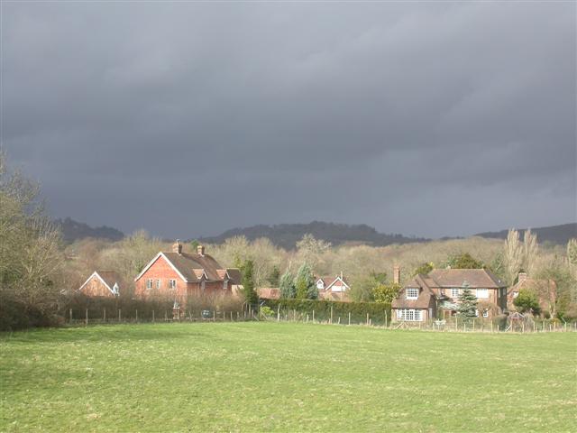 | Houses along the A286 just south of Fernhurst, with a brewing storm looming over Blackdown.