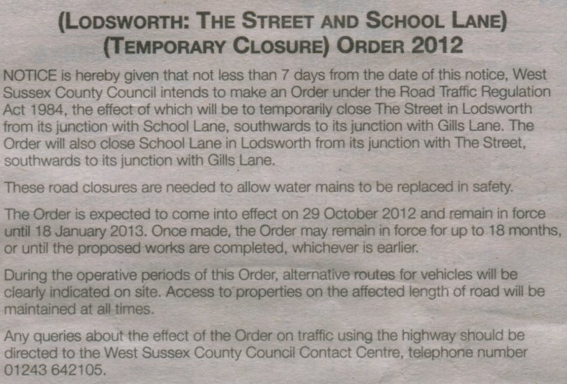 Lodsworth Road Closure Order, West sussex County Council, October 2012