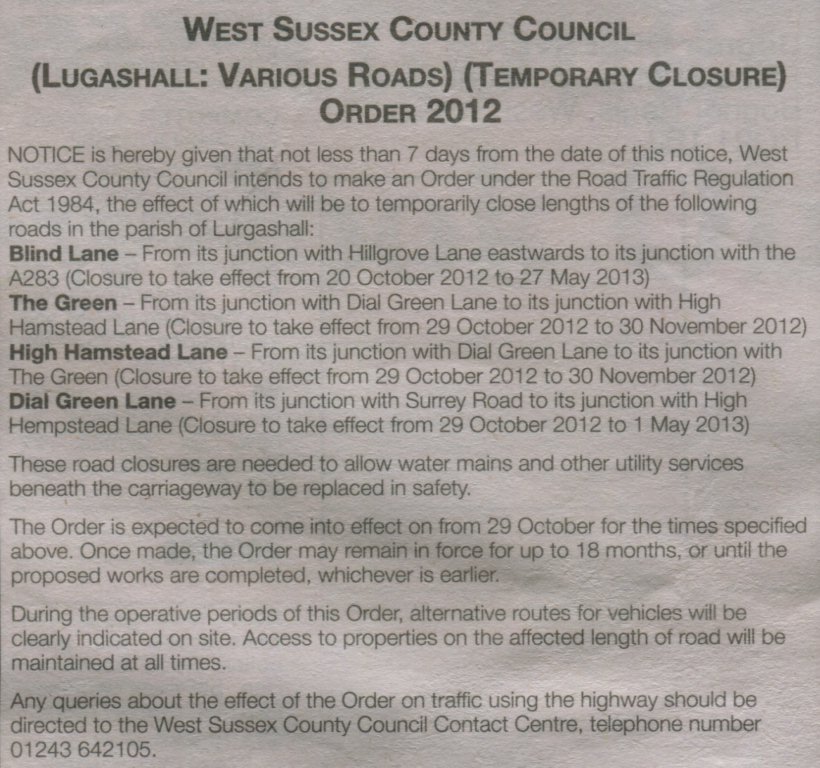 Lurgashall Road Closure Order, West sussex County Council, October 2012