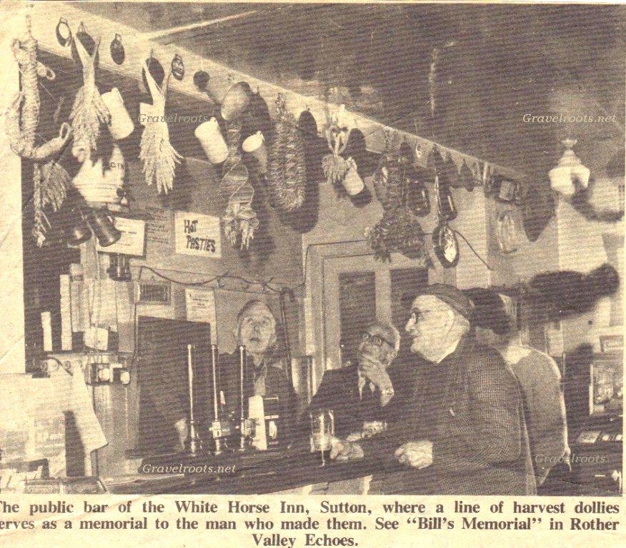 | Ernie Budd sits at the bar of the White Horse, Sutton, with a few of his many 'Corn-Dollies'.